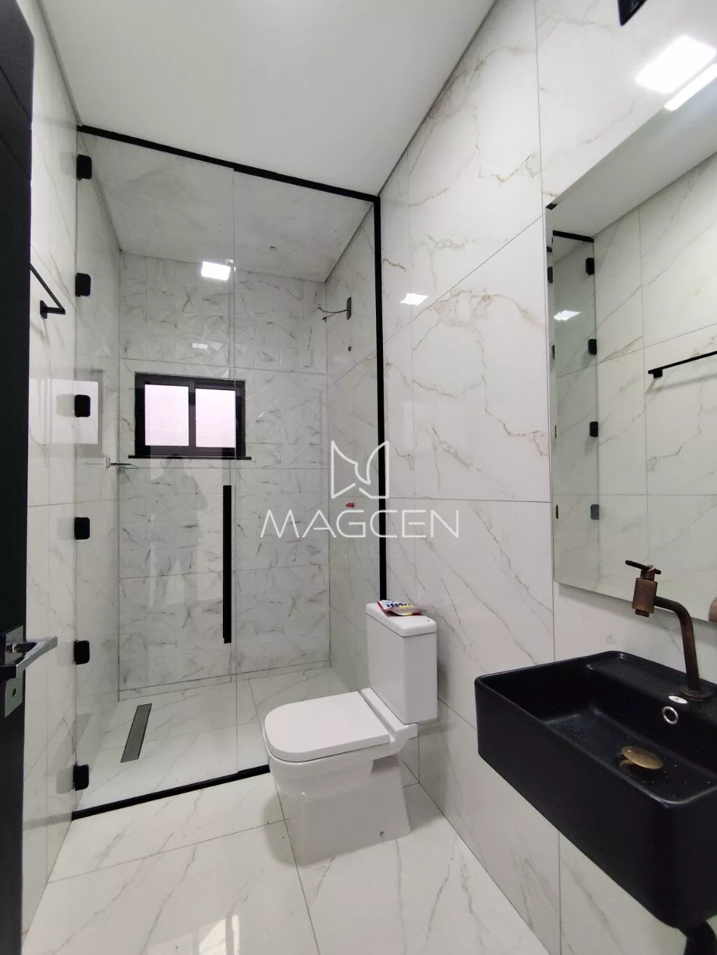 -1 banheiro com box de vidro até o teto e balcão sob medida;